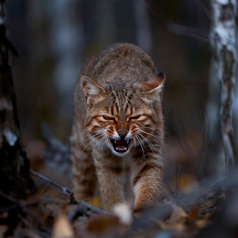 aggressive cat, animal, autumn leaves, birch trees, ears perked, fangs, feline, forest, growling cat, nature, predator, snarling bobcat, stalking, striped fur, whiskers, wildcat, wildlife, woods, yellow eyes, bobcat