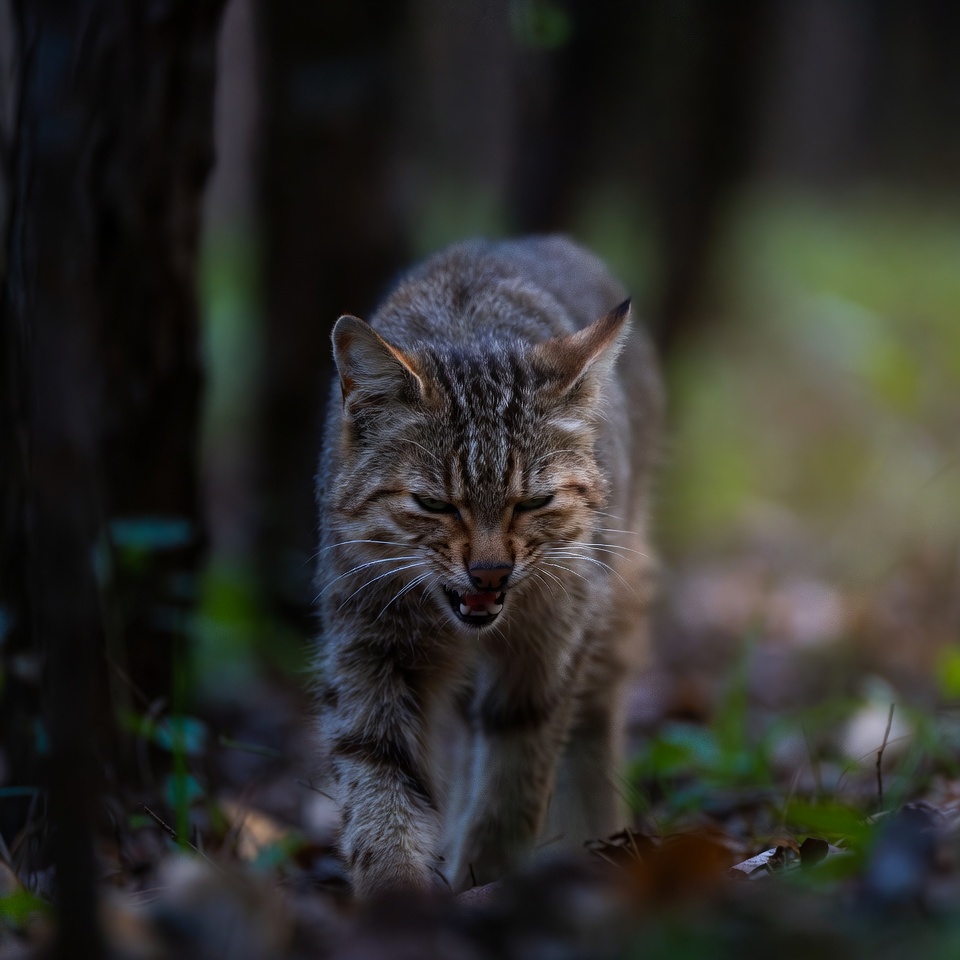 animal portrait, dark woods, feline, forest, grass, gray fur, intense eyes, lynx, nature, predator, snarling mouth, stalking, striped fur, trees, undergrowth, walking, wild animal, wildcat, wildlife, woods, bobcat