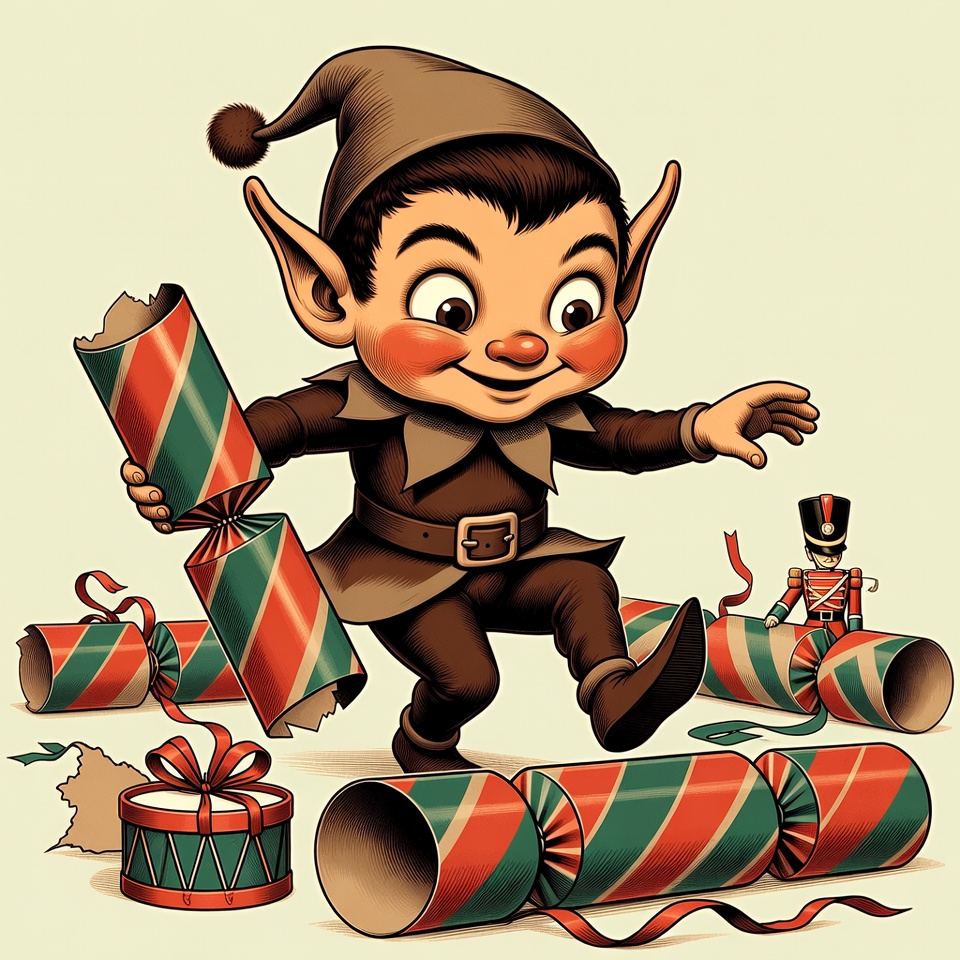 A cheerful cartoon elf with pointy ears, brown hat, and green tunic pulls a large red and green Christmas cracker. Broken crackers and colorful ribbons litter the floor around him, with a small toy soldier and gift box nearby. The vintage illustration features a festive holiday scene on a light background.