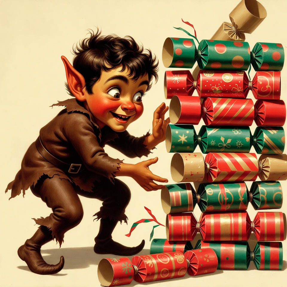 Christmas crackers, Christmas elf, brown hair, cartoon elf, cheerful elf, clipart style, curly hair, elf shoes, festive stack, gold crackers, green crackers, grinning elf, holiday decorations, holiday illustration, isolated background, pointy ears, ragged clothes, red crackers, stacking crackers, vintage illustration, white crackers, wide eyes, elf