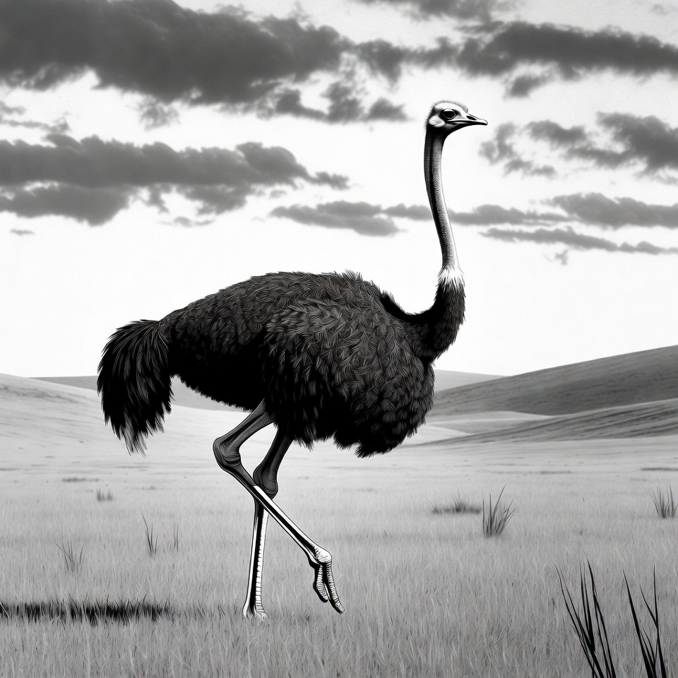 animal, bird, black and white, clouds, feathers, grassy field, hills, isolated background, legs, long neck, monochrome, nature, plains, savanna, sky, standing, wildlife, ostrich