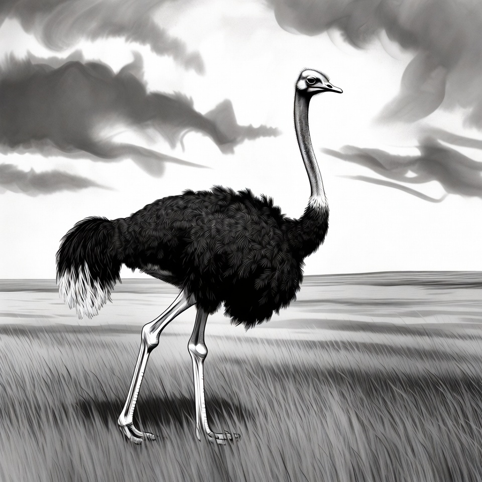 A detailed black and white illustration of an ostrich standing on a grassy plain. The ostrich has fluffy black feathers, long thin legs, and a long neck with a small head. Dark stormy clouds fill the sky behind it.