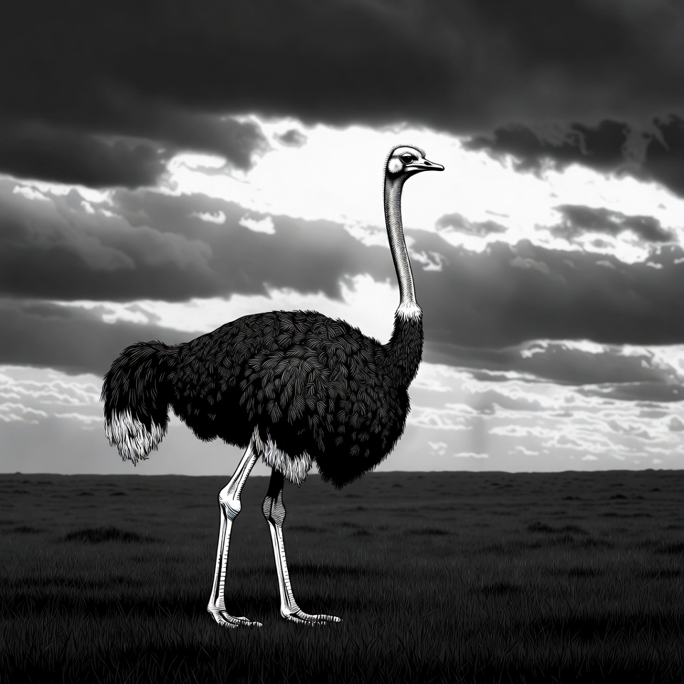 A black and white illustration of an ostrich stands tall on a grassy plain under a cloudy sky. The ostrich has a long neck, distinctive feathers, and long legs. Dramatic clouds fill the background.