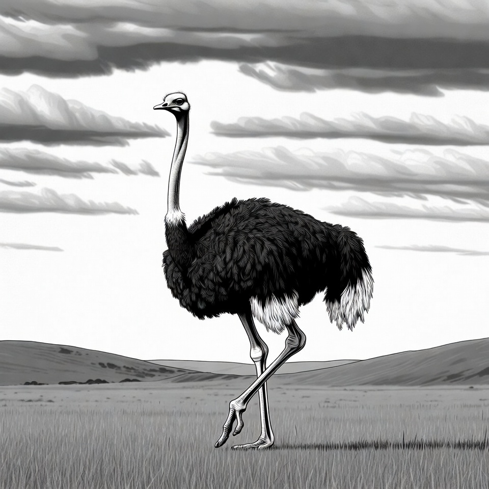 A black and white illustration depicts a tall ostrich standing on a grassy plain under a cloudy sky. The ostrich has a long neck, small head with large eyes, fluffy black feathers, and white wing tips. Gentle hills are visible in the background.