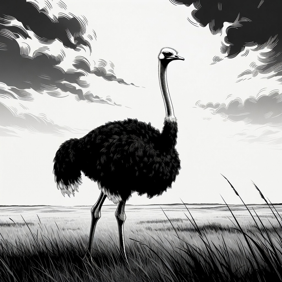 A black and white ink illustration depicts a tall ostrich standing in tall grass with stormy clouds in the sky. The ostrich faces slightly to the side, with detailed feathers and a long neck. The scene features a flat horizon and reeds in the foreground.