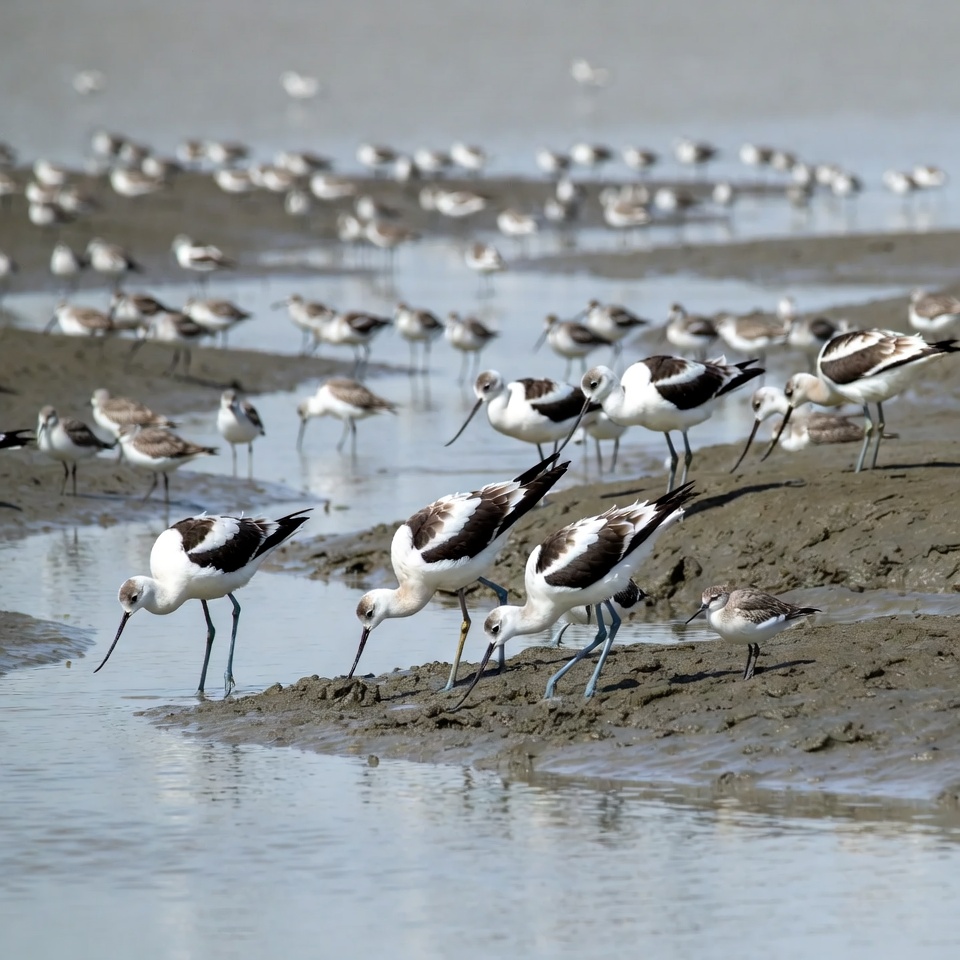 birds, black white plumage, feeding, flock, flock birds, foraging, long legs, muddy shore, mudflat, nature, pink legs, shallow water, shore, shorebirds, stilts, thin bills, wading birds, waterbirds, wetland, wildlife, black-winged stilts