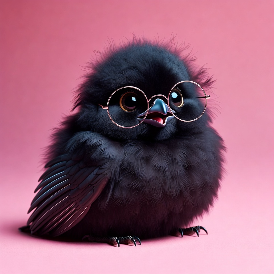 adorable, baby owl, big eyes, bird, black owl, cartoon owl, chick, cute owl, digital art, feathers, fluffy owl, glasses, illustration, nerdy owl, owlet, pink background, round glasses, talons, wings, owl