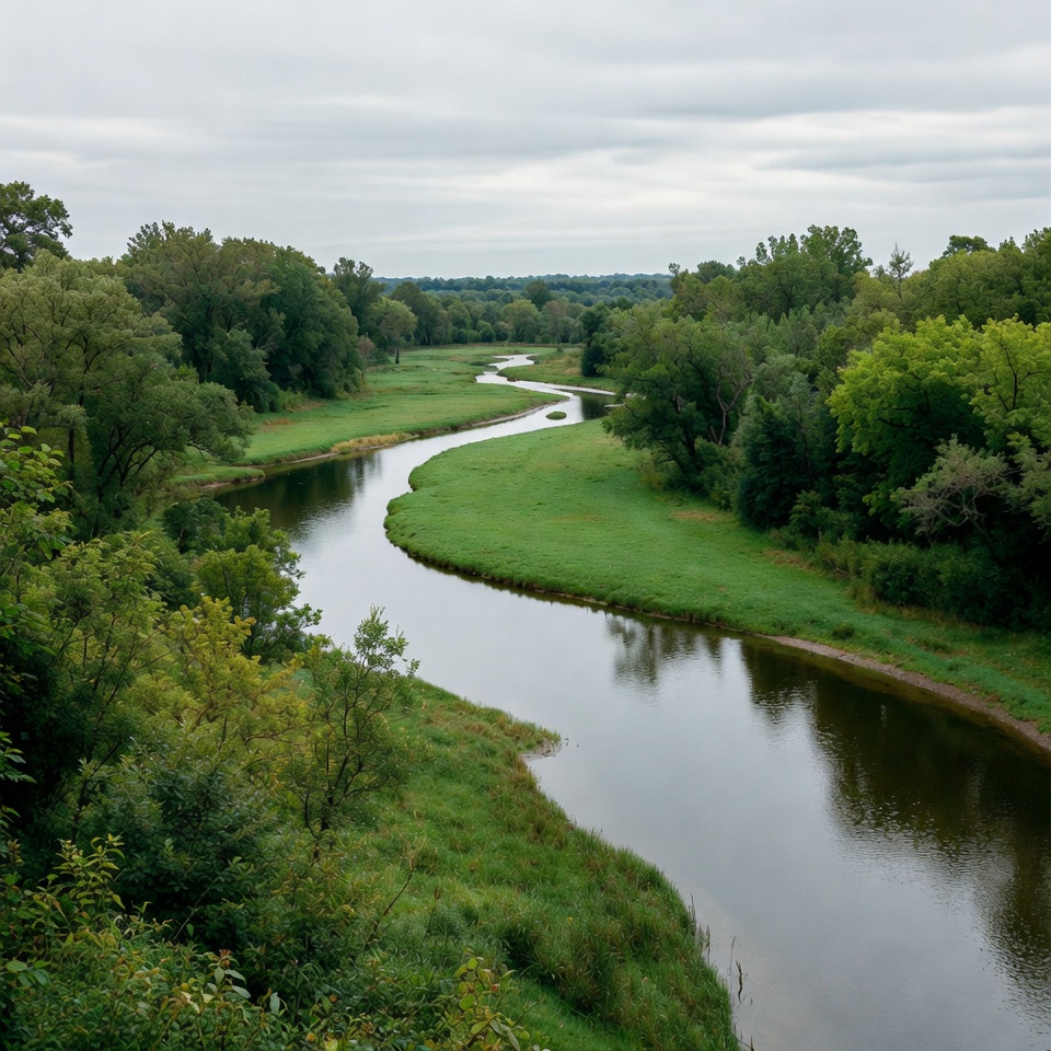A serene river winds through lush green meadows and dense forests under a cloudy sky. The water reflects the surrounding trees and grass along its curved banks. The landscape features vibrant autumn foliage and smooth river bends viewed from an elevated angle.