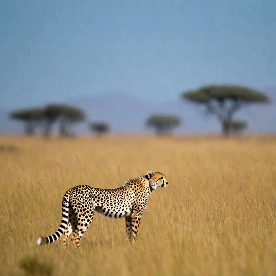 African wildlife, acacia trees, blue sky, golden grass, grass, grassland, horizon, mountains, nature, predator, safari, savanna, spotted fur, standing cheetah, tall grass, wild animal, wildlife photography, cheetah
