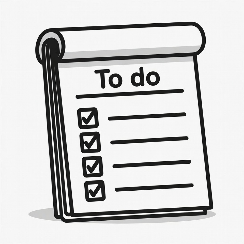 A simple line art illustration of a white notepad with a curled top corner labeled 'To do'. It features several checklist items with checkmarks in boxes. The notepad stands on an isolated white background.