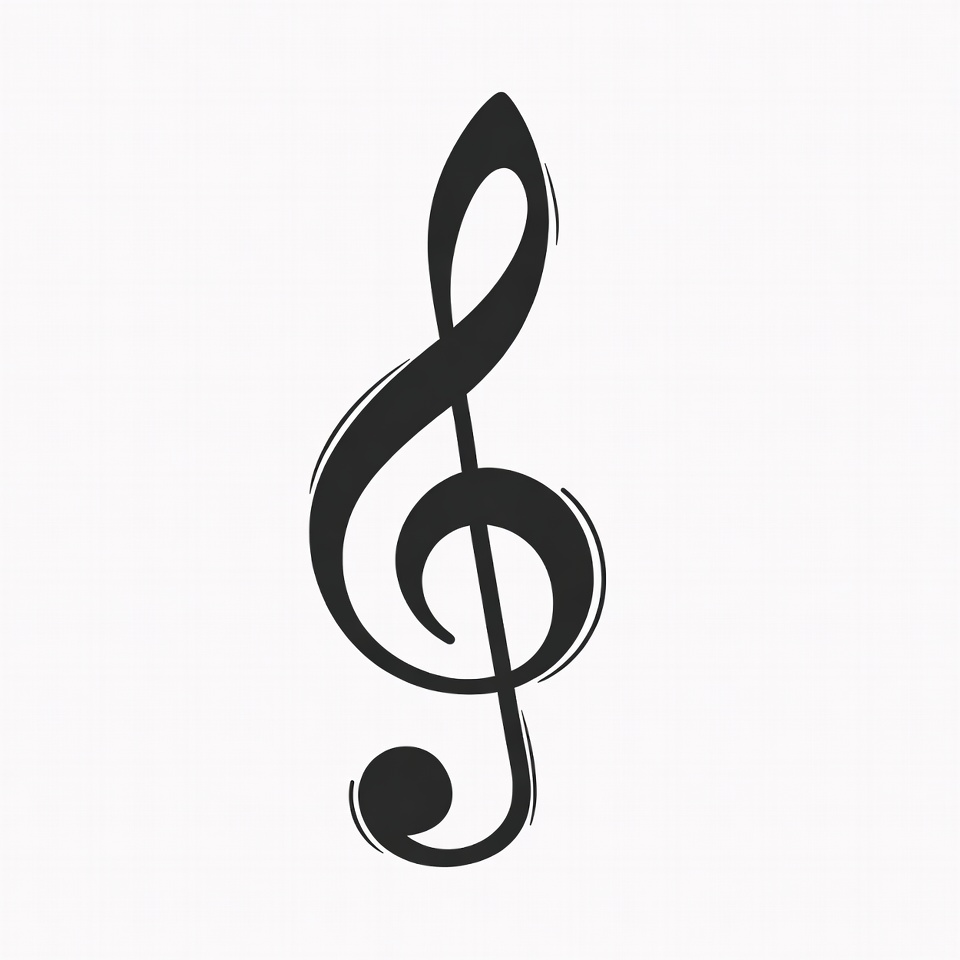 A black treble clef symbol is illustrated with smooth, curved lines and outlines. It features a prominent loop and tail on a plain white background. The design is simple and bold, suitable for music notation.