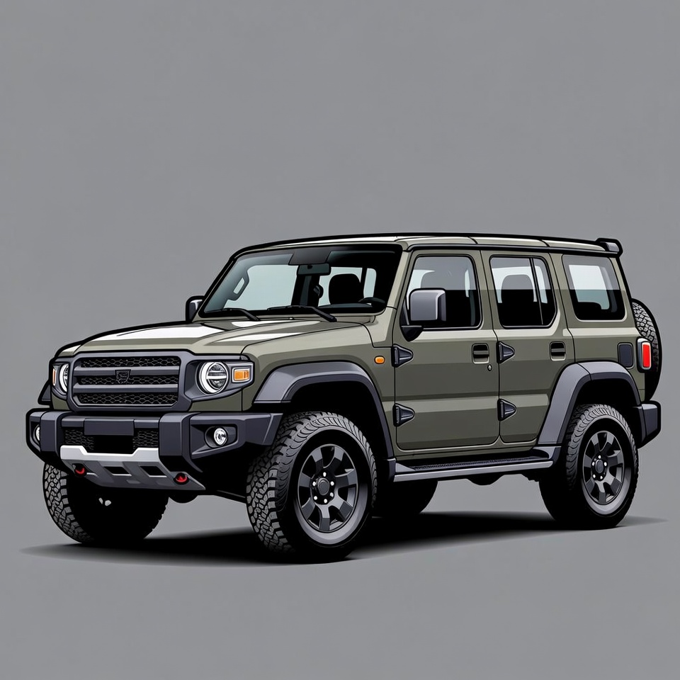 A detailed illustration of a rugged green four-door SUV with off-road features. It has black wheels, a roof rack, and a spare tire on the rear door. The vehicle is centered on a plain gray background.
