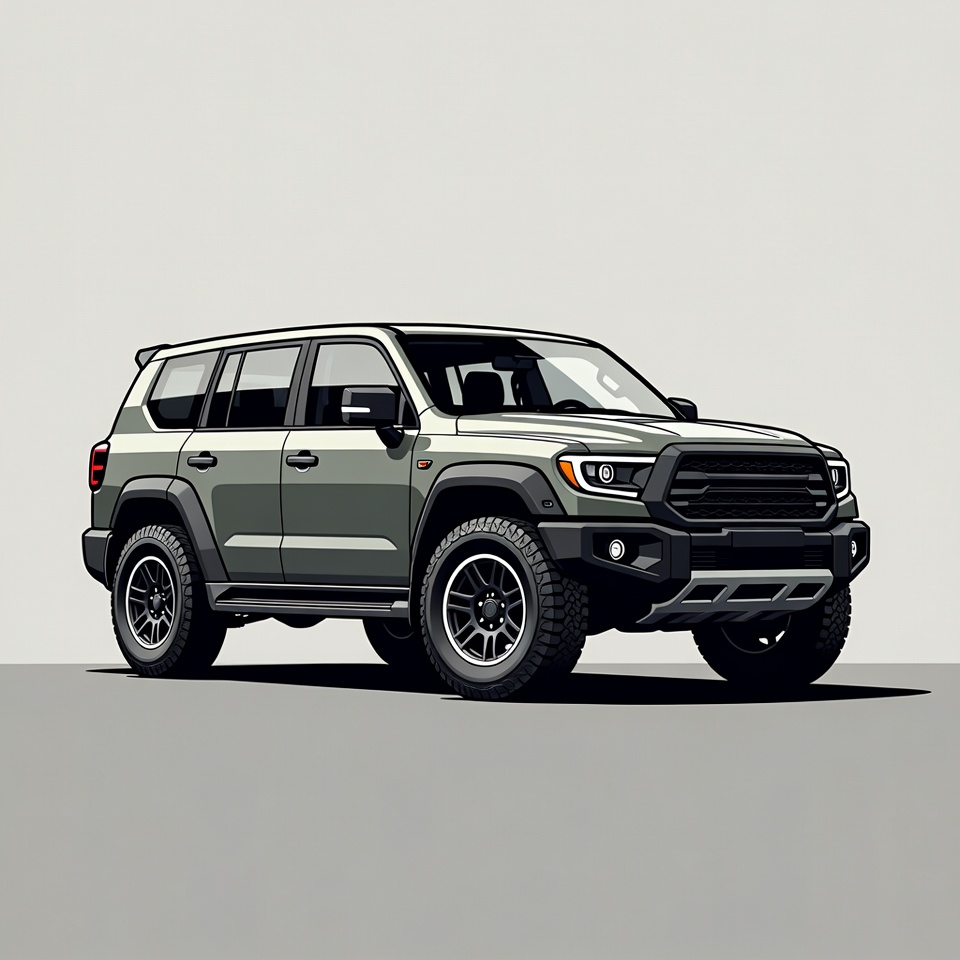 4x4, SUV, adventure vehicle, automotive illustration, black rims, bumpers, car design, gray car, headlights, illustration, large wheels, luxury SUV, off-road vehicle, roof rails, rugged SUV, side mirrors, vector art, white background, Toyota Land Cruiser