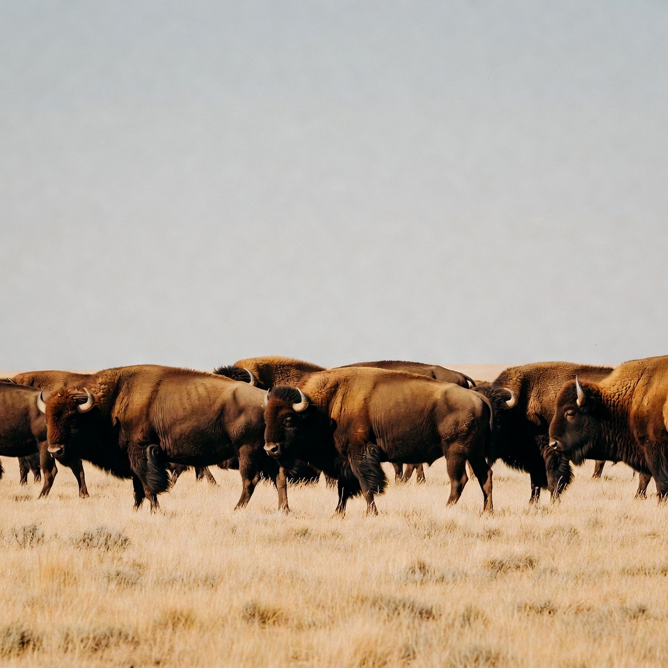 American bison, North American wildlife, animals, brown fur, buffalo, curved horns, dry grass, golden grass, grassland, grazing, group, herd, nature, open field, outdoors, pale sky, prairie, standing, walking, wild animals, wildlife, bison