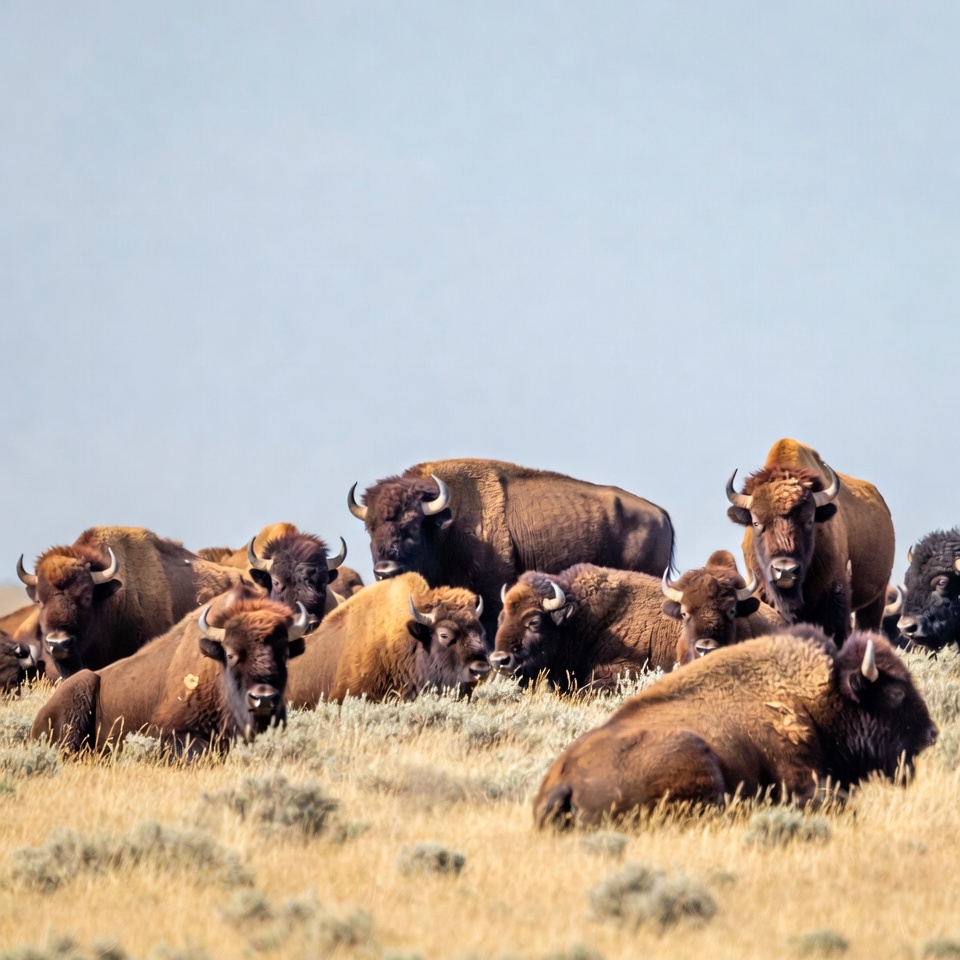 A large herd of brown bison lies and stands on a dry grassy plain under a clear sky. Their shaggy fur and curved horns are prominent as they rest in the field. The scene features multiple bison scattered across the golden grass.