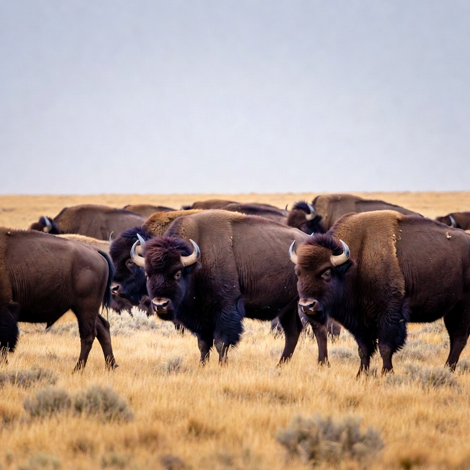 Herd of Bison in Golden Grassland