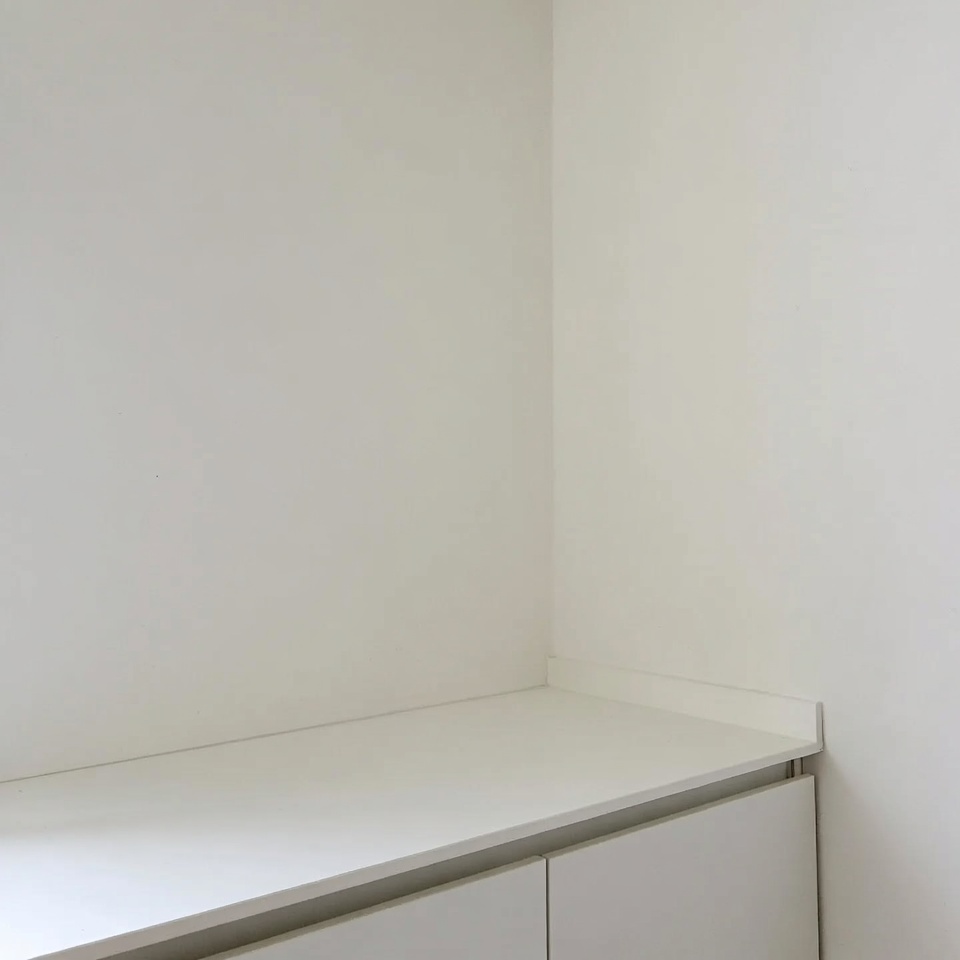A modern white kitchen corner features a countertop with cabinets below. The cabinets have double doors and are mounted against plain white walls. The setup is minimalist with clean lines and no other objects visible.