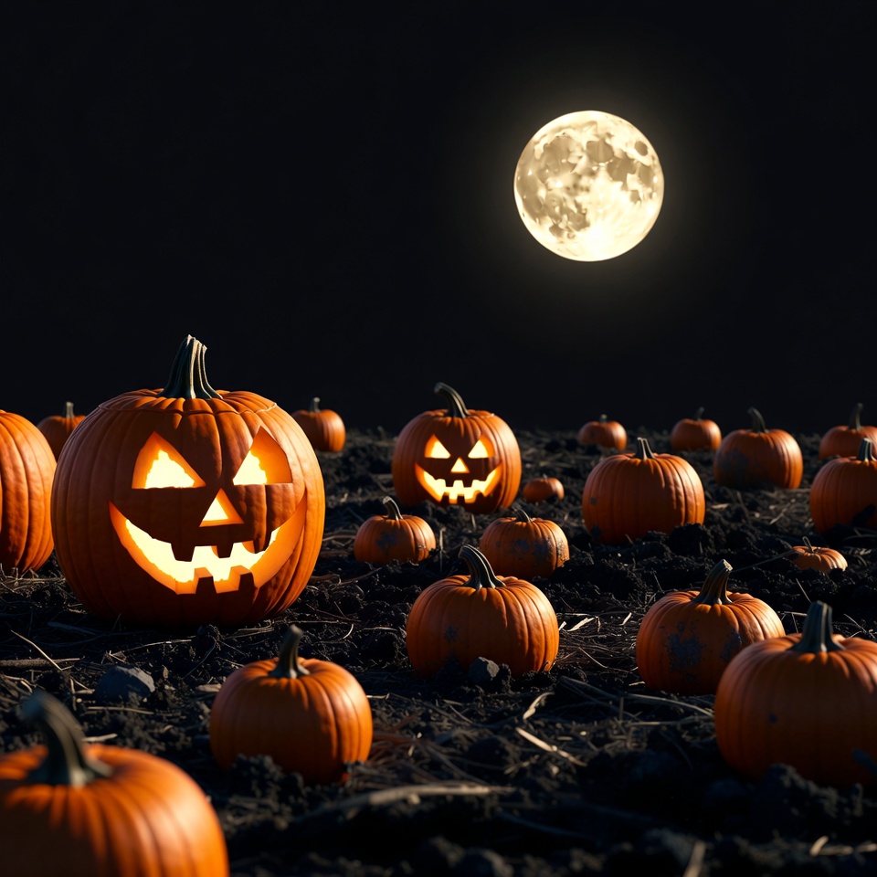 A field of orange pumpkins and carved jack-o'-lanterns with glowing faces lit from within sits on dark soil. A large full moon shines brightly in the black night sky behind them. Several prominent jack-o'-lanterns display eerie smiling expressions.