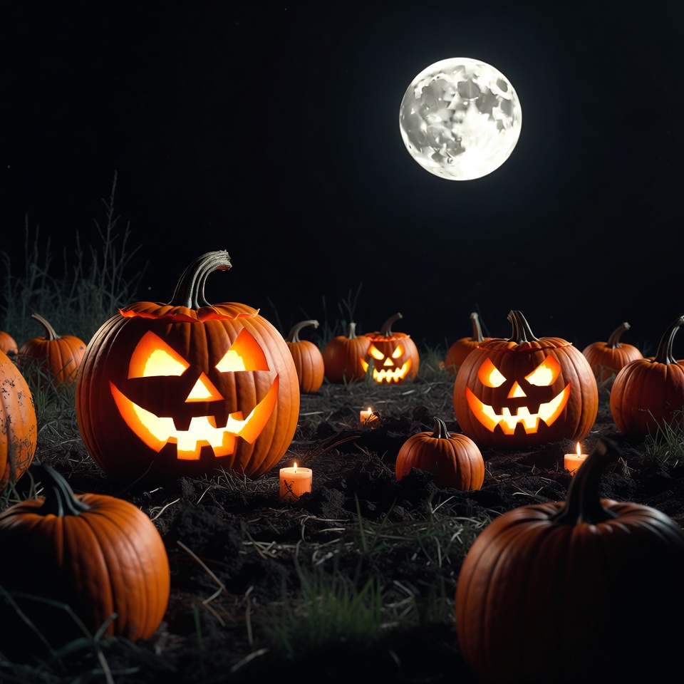 Jack-o'-lanterns under full moon