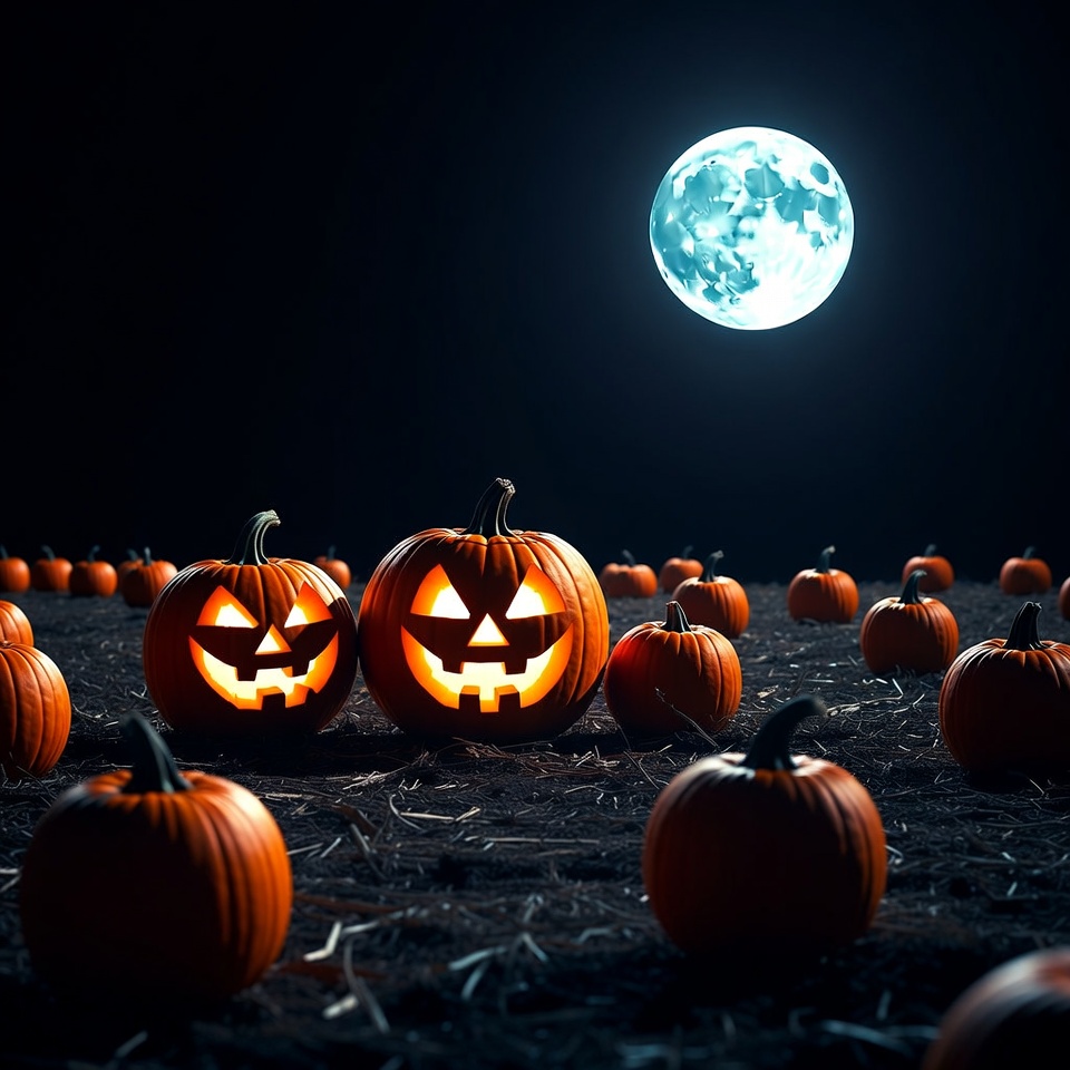 Two large glowing jack-o-lanterns with carved faces sit prominently in the foreground on a dark ground covered in straw. Numerous smaller orange pumpkins and lit jack-o-lanterns are scattered around them. A large blue full moon shines brightly in the black night sky behind.