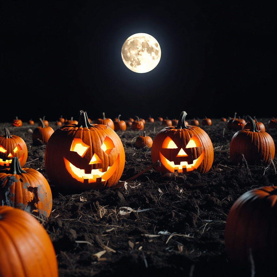 A field of pumpkins and carved jack-o-lanterns with glowing faces sits on dark soil under a large full moon. The orange pumpkins are scattered across the ground, illuminated by the moonlight. Several jack-o-lanterns feature spooky carved expressions.