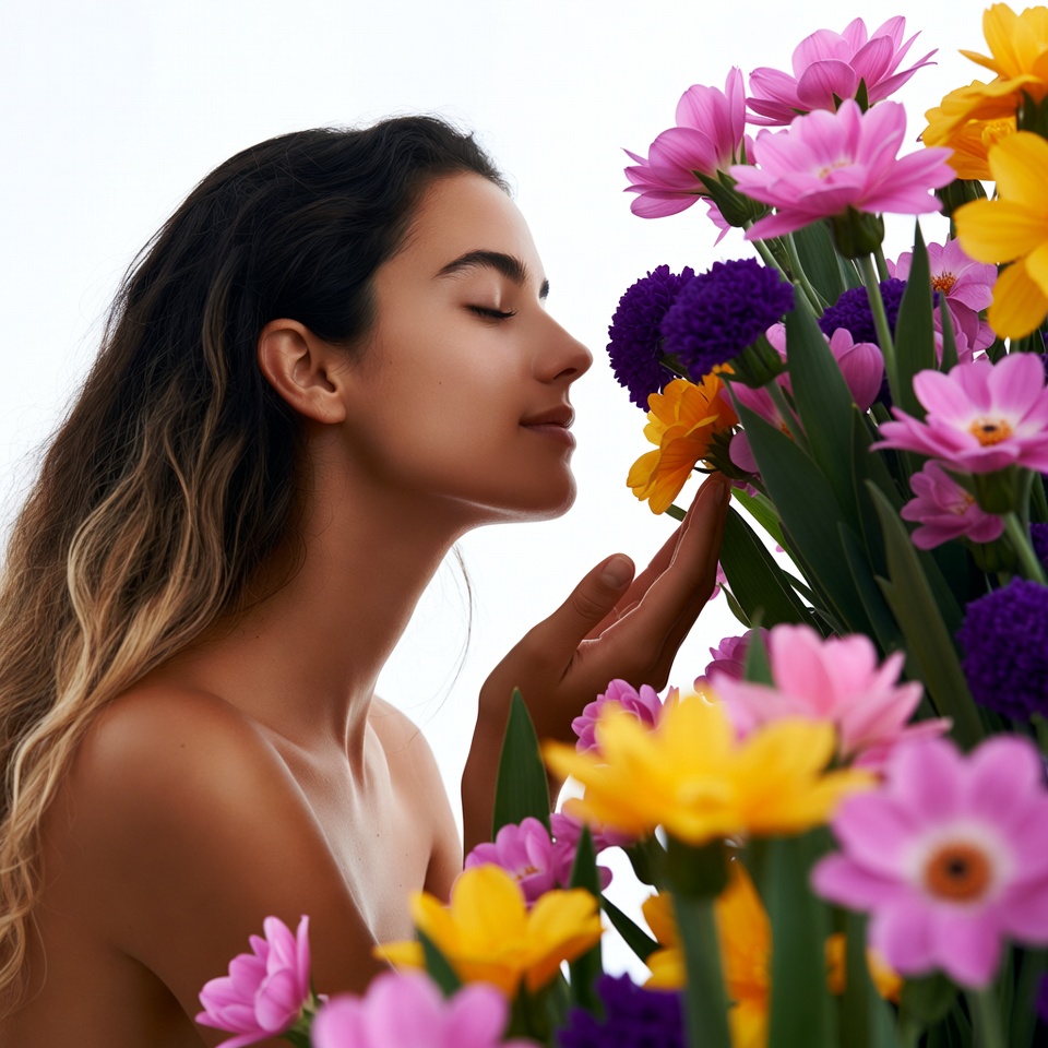 A young woman with long wavy dark hair and light skin turns her face toward a vibrant bouquet of pink, yellow, and purple flowers. She gently touches and inhales the blooms with her eyes closed and a subtle smile. Her shoulders are bare, and the scene is set against a plain white background.