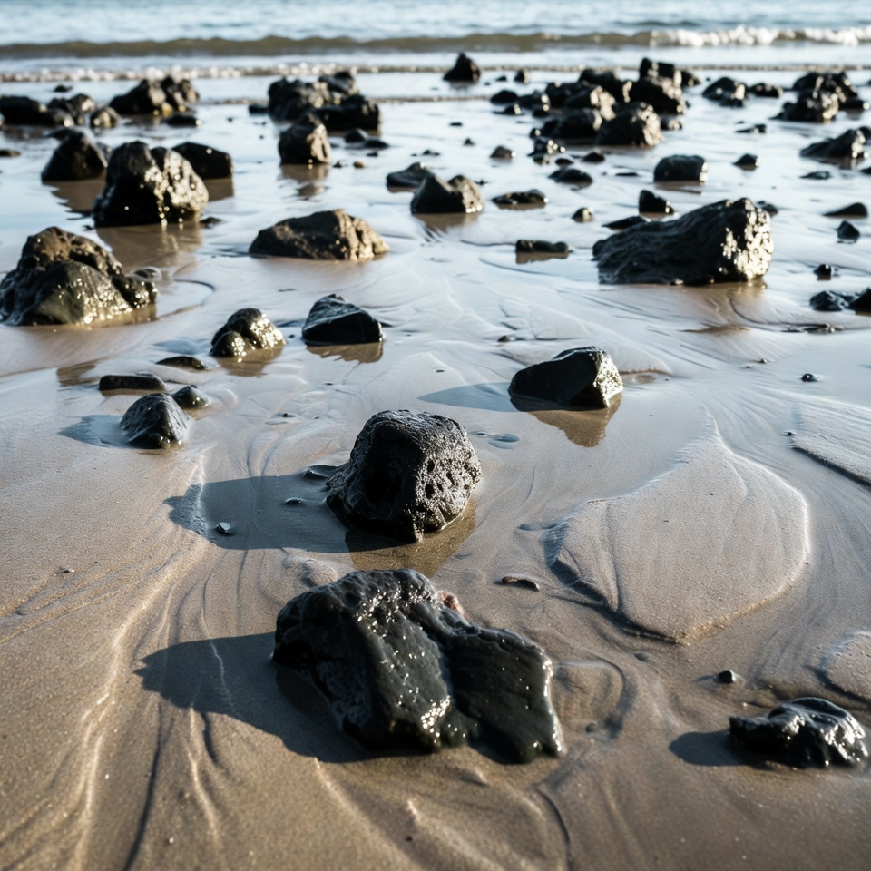 A sandy beach shore is covered with numerous dark, wet rocks scattered across the wet sand. Gentle waves lap at the edge in the background under a clear sky. Shadows from the rocks create patterns on the glistening surface.