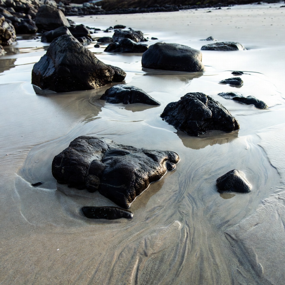 beach, coast, landscape, low tide, nature, ocean, outdoors, pebbles, rocks, sandy beach, sea rocks, seashore, shoreline, stones, tide, water, waves, wet sand, black rocks