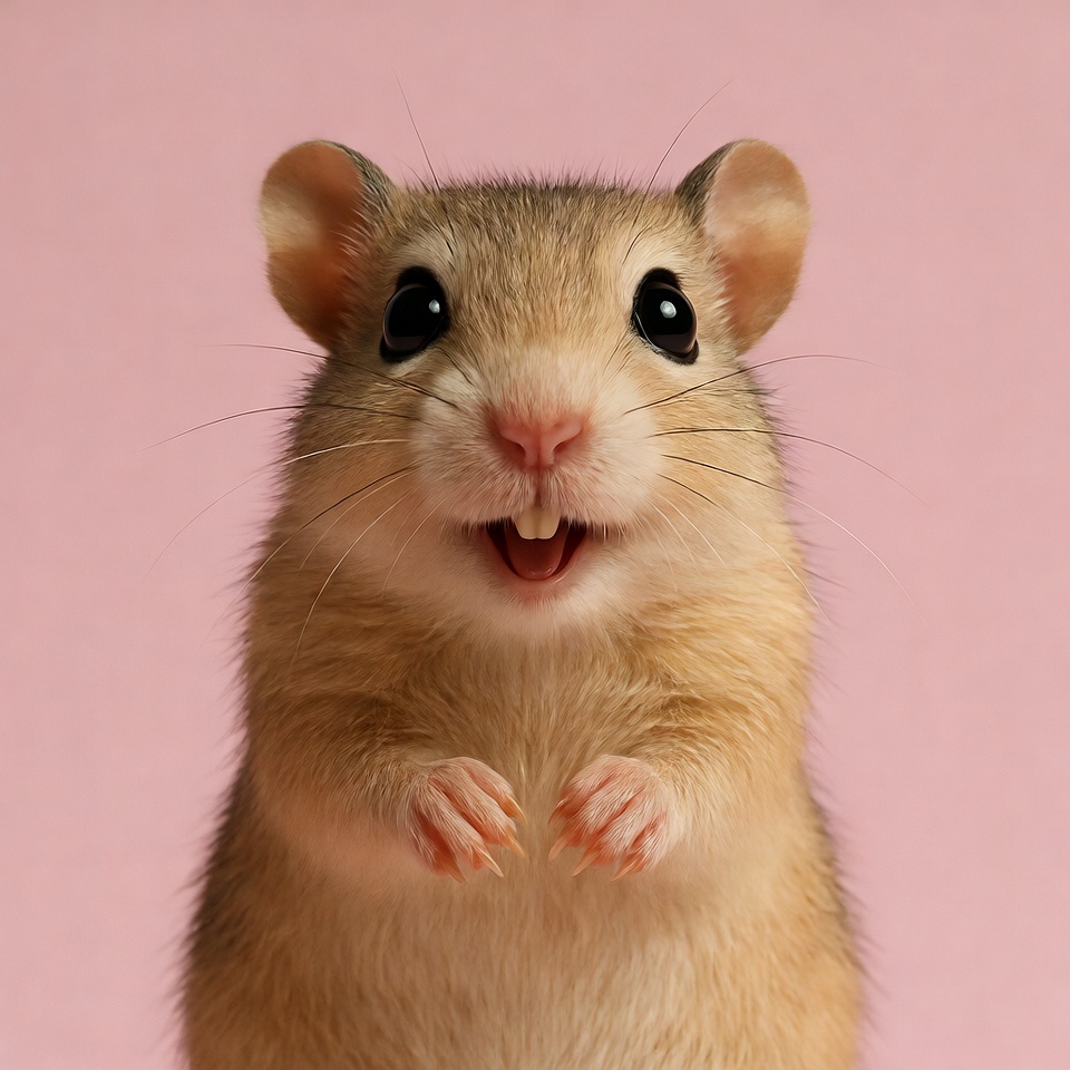 animal portrait, big eyes, brown fur, cute gerbil, fluffy fur, front paws, happy gerbil, isolated background, pink background, pink nose, rodent, small animal, smiling animal, white teeth, gerbil