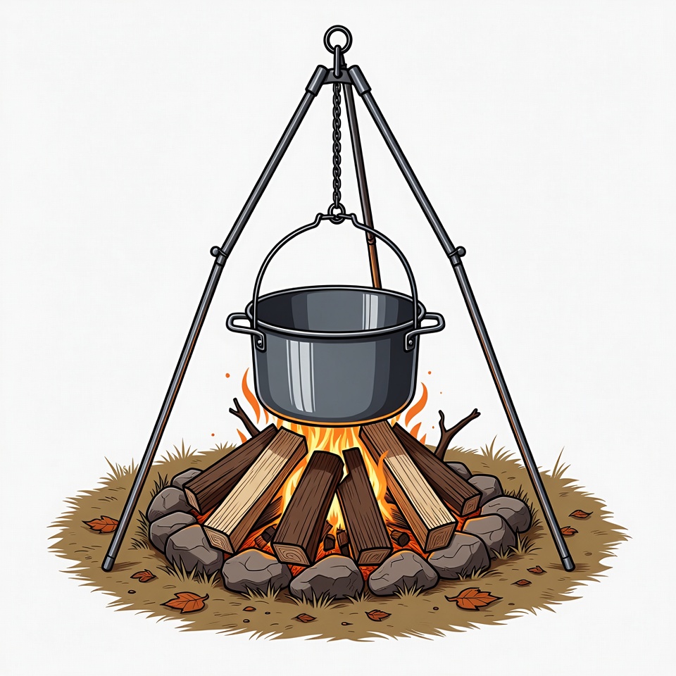 camp pot, camping, clipart, cooking pot, dutch oven, fire, firewood, flames, hanging pot, illustration, isolated background, leaves, logs, outdoor cooking, pot, rocks, tripod, wilderness cooking, campfire