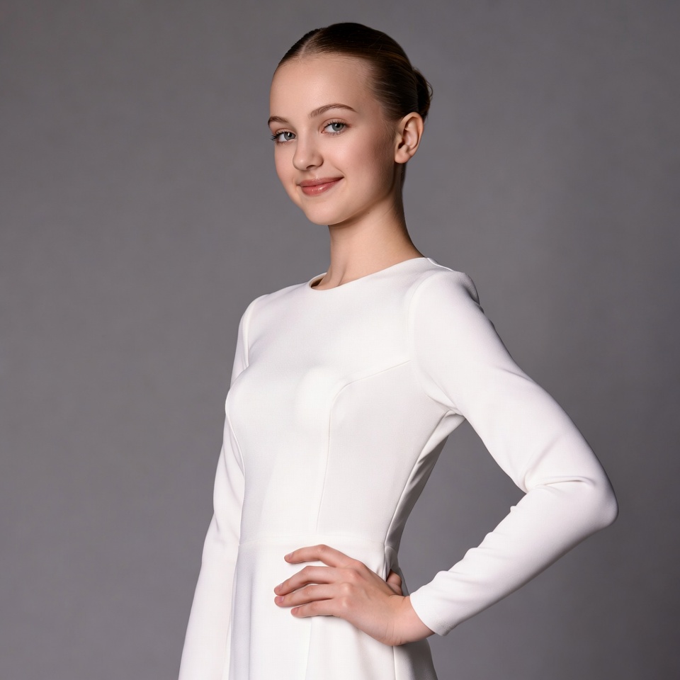 A young woman with light skin, blue eyes, and blonde hair in a bun stands smiling on a gray background. She wears a long-sleeved white dress with a high neckline and poses with one hand on her hip. Her expression is gentle and confident.