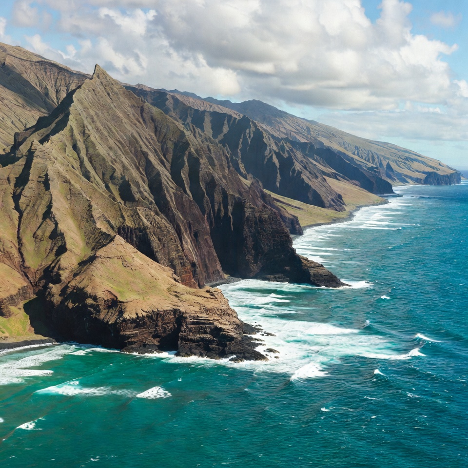 Hawaii, Kauai, Pacific Ocean, aerial view, beach, blue water, cliffs, clouds, coastal mountains, coastline, dramatic scenery, earthy tones, green slopes, landscape, mountains, nature, ocean, rocky shore, rugged cliffs, sea, sky, surf, turquoise water, volcanic cliffs, waves, Na Pali Coast