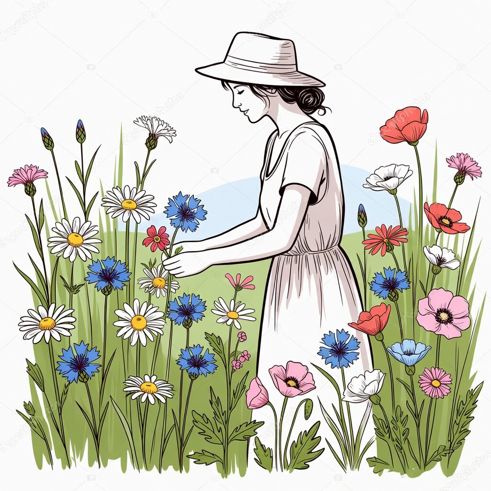 A woman wearing a white dress and wide-brimmed hat bends down to pick colorful flowers in a lush garden. The illustration features vibrant blooms like daisies, poppies, cornflowers, and pink flowers amid green grass. She has her dark hair in an updo and is viewed from the side against a simple background.