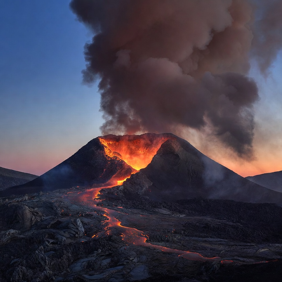 ash cloud, crater, dusk sky, earth science, erupting volcano, eruption, fire, geology, glowing lava, lava, lava flow, magma, molten lava, mountain, natural disaster, nature, orange lava, rocky terrain, smoke plume, volcanic ash, volcanic eruption, volcanic landscape, volcano