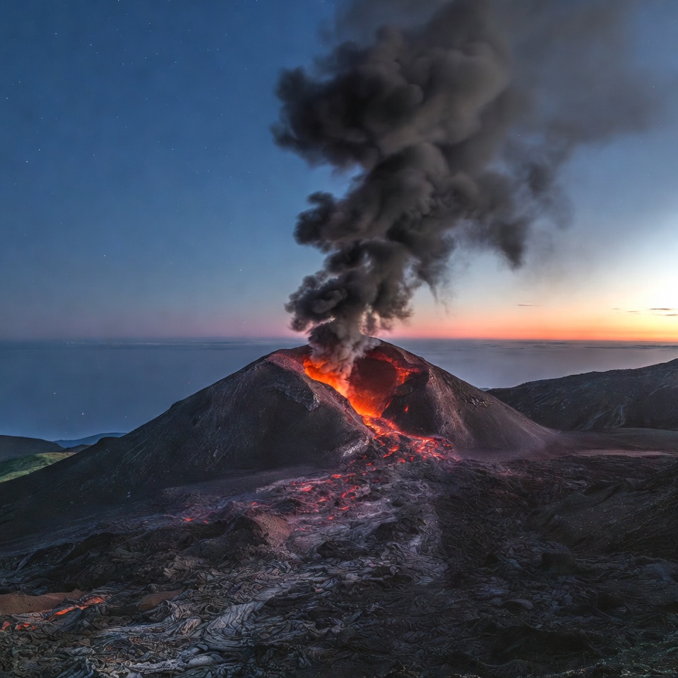 ash cloud, black smoke, crater, dramatic sky, earth science, eruption, geology, hills, landscape, lava, molten lava, mountain, nature, nightfall, orange glow, rocky terrain, smoke, twilight, volcanic activity, volcano