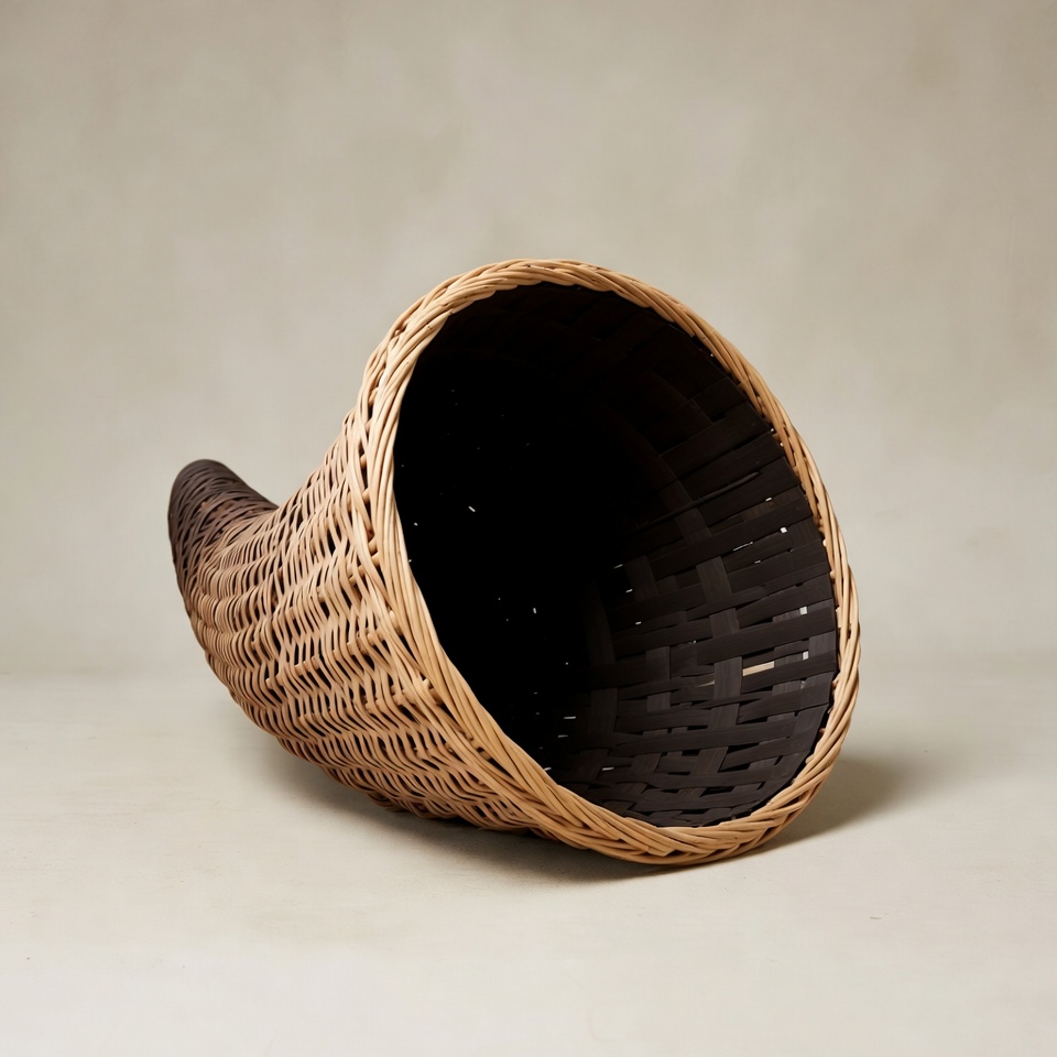 A large woven cornucopia made of brown wicker lies tilted on a light beige background. The horn-shaped basket features intricate braiding with darker accents inside the open mouth. It is empty and isolated against the plain surface.