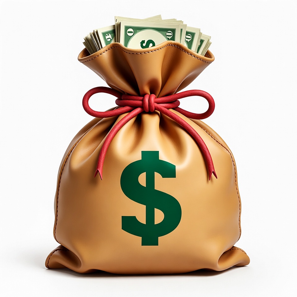 A golden money bag filled with US dollar bills is tied with a red ribbon bow. A large green dollar sign is printed on the front of the bag. The bag stands upright against a white background.