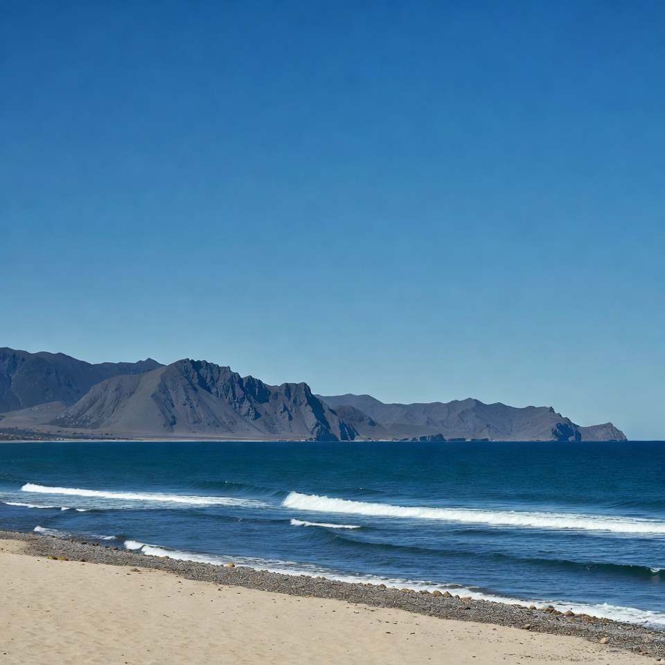 A sandy beach meets gentle waves of the deep blue ocean under a clear blue sky. In the background, rugged brown mountains rise along the horizon. The scene features calm waters and a pebbled shoreline.