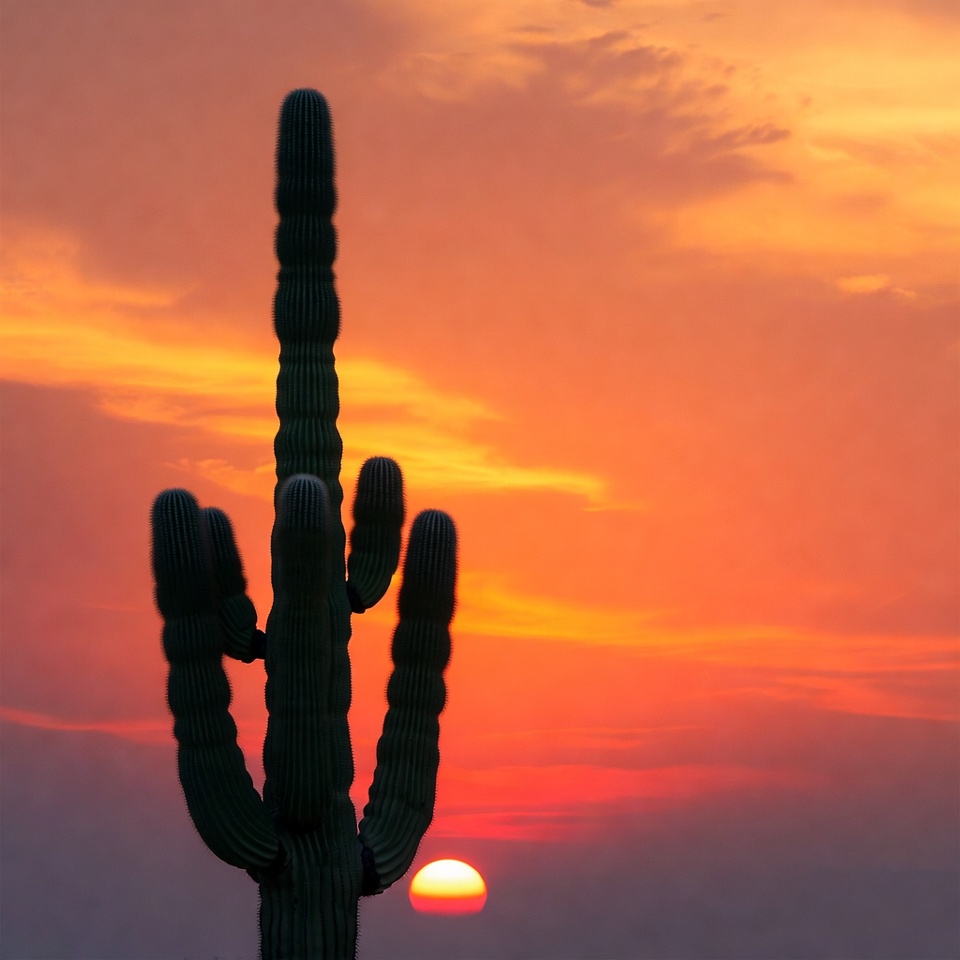 Arizona cactus, arms cactus, backlit, cactus, clouds, desert, desert plant, golden hour, horizon, iconic cactus, landscape, nature, orange sky, silhouetted cactus, southwest, sun, sunset, tall cactus, vibrant sunset, saguaro cactus