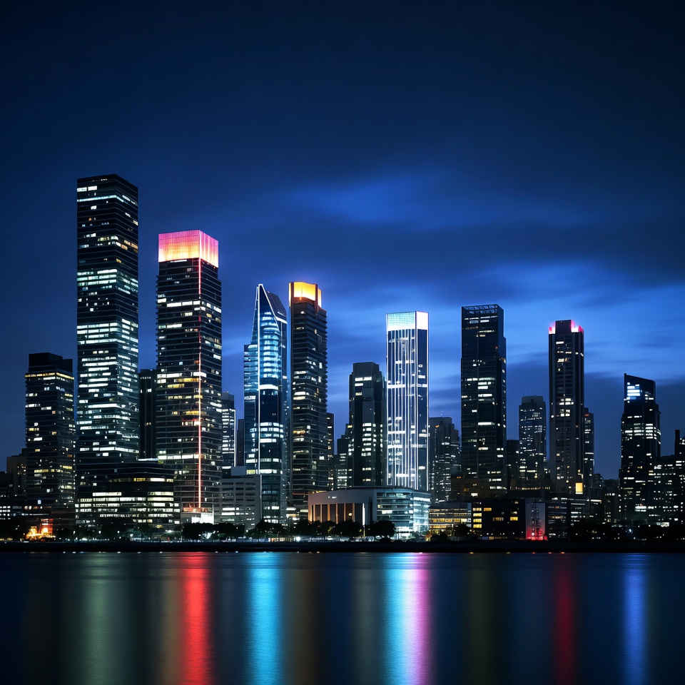Vibrant Night Skyline Over River
