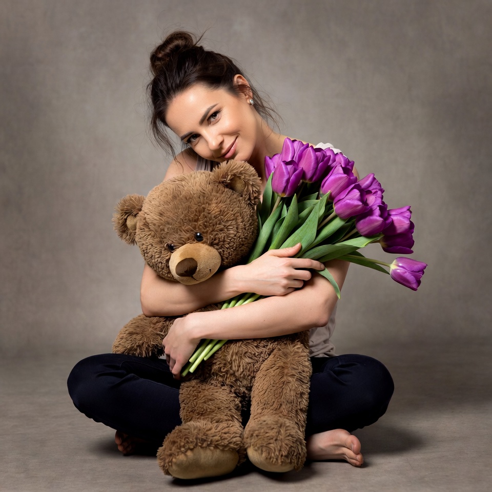 A smiling woman with dark hair in a bun sits on the floor hugging a large brown teddy bear. She holds a vibrant bouquet of purple tulips in her arms. She wears a white top and dark pants with bare feet against a gray background.