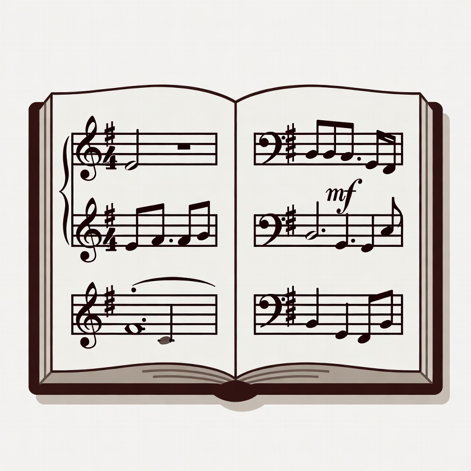 An illustration of an open book displaying sheet music with musical notes, staffs, and symbols like treble and bass clefs. The pages feature various notes, sharps, flats, and dynamics markings such as mf. The design is outlined in black on a white isolated background.