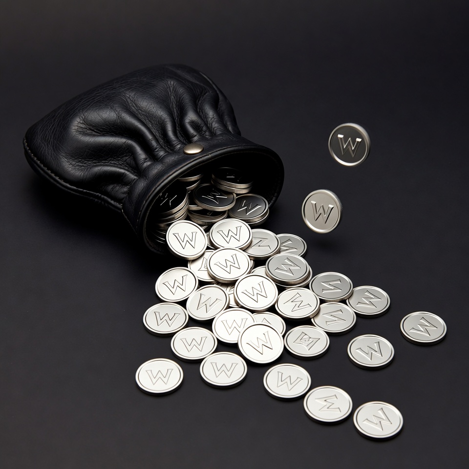 A black leather drawstring pouch is tilted open on a dark background, spilling out numerous shiny silver coins engraved with the letter W. Some coins are falling mid-air while others are scattered below the pouch. The coins have a metallic gleam against the black backdrop.