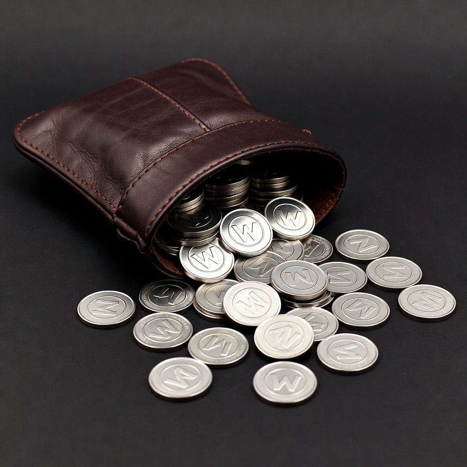 A brown leather pouch with a drawstring top is tilted open on a black background, spilling out numerous shiny silver coins. The coins feature a prominent 'W' emblem and are scattered around the pouch. The image highlights the texture of the leather and the metallic sheen of the coins.