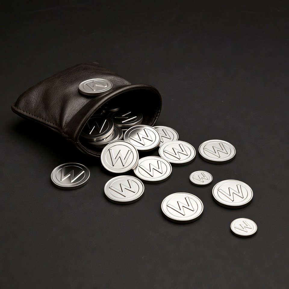 A brown leather pouch is tilted open on a black background, with numerous silver coins spilling out. The coins feature a prominent 'W' emblem and are scattered around the pouch. The image highlights the metallic shine of the coins against the dark surface.