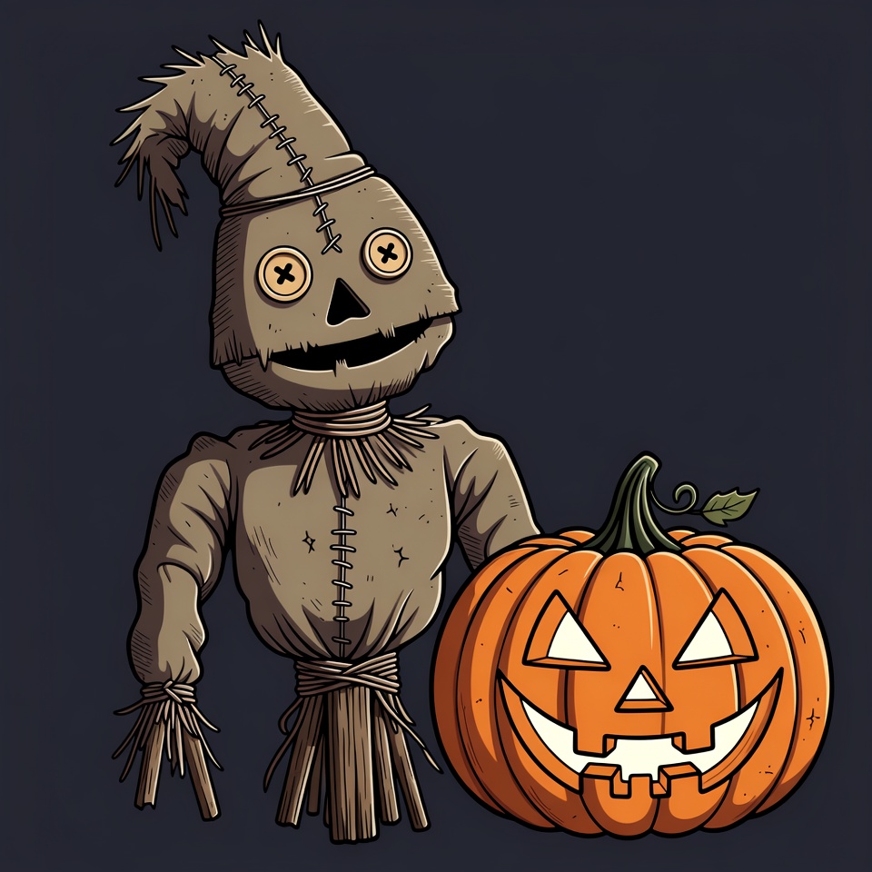 A cartoon scarecrow with stitched face and straw hat stands beside a grinning jack-o-lantern pumpkin. The scarecrow has exaggerated eyes and a wide smile, wearing ragged stitched clothing stuffed with straw. Both figures are on a dark isolated background.