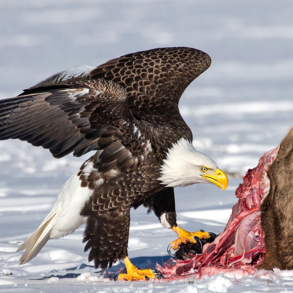 A bald eagle with white head and tail stands on snow, gripping a carcass with its yellow talons. Its wings are partially spread, and it tears into the raw meat of the brown-furred animal. The background is a snowy landscape.