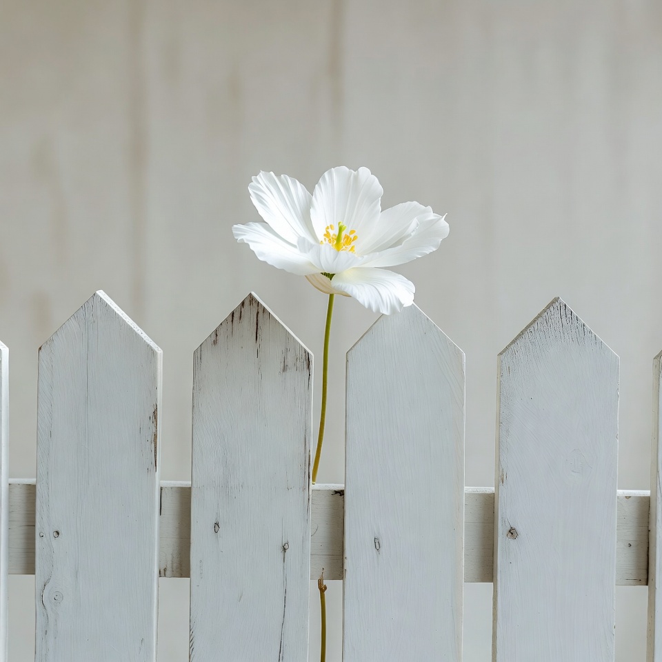 A single white flower with yellow center grows through a white picket fence. The flower stands tall against the wooden slats on an isolated light background. Its delicate petals are fully bloomed.
