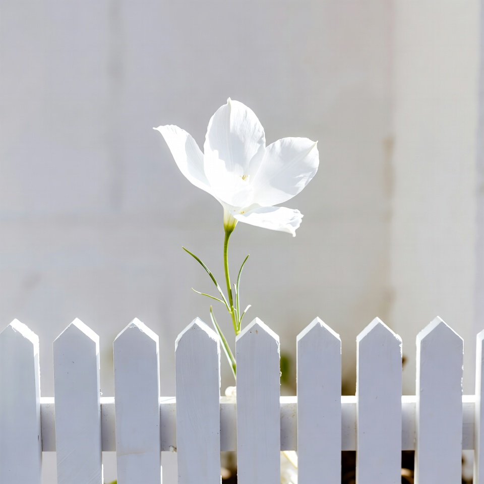 A single white flower with delicate petals blooms atop a short white picket fence. The flower stem rises from the fence against a plain white background. Sunlight softly illuminates the scene.