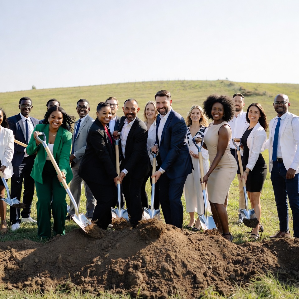 A large diverse group of men and women in business suits holds shovels and digs into a mound of dirt during a ground breaking event. They stand on a grassy hill under a clear sky, smiling and posing together. The professionals include African-American, White, and other ethnicities, dressed in formal attire like suits, dresses, and blazers.